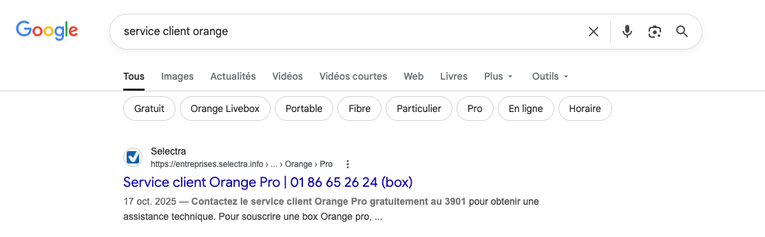 En tapant « service client orange » ou « assistance Orange », l’utilisateur arrive en première page sur un lien du site « Echos du net » intitulé « Appeler numéro Orange gratuit (01 86 26 69 47) ». Echos du net est édité par Selectra, dont le site apparaît également avec ce numéro lorsque l’on cherche « service client orange ». Ce numéro n’est pas celui du service client orange mais celui des conseillers de Selectra.