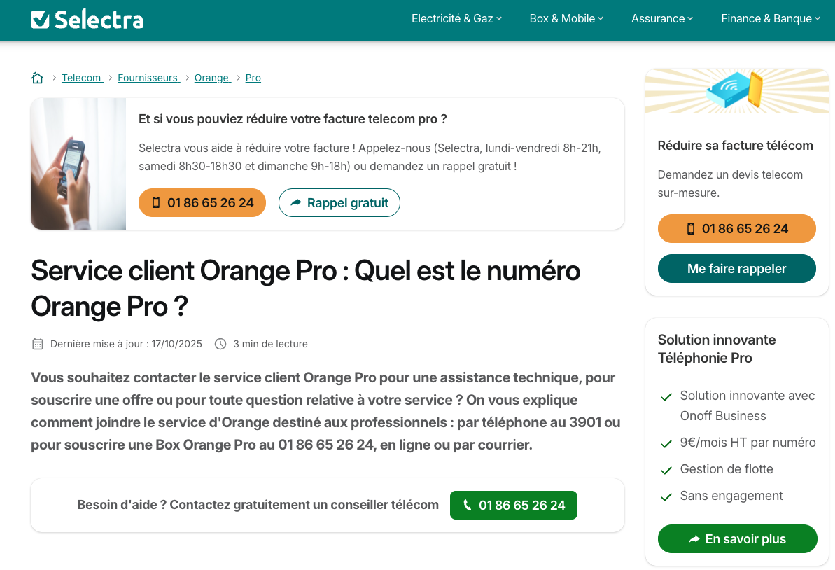 Le numéro « 01 86 65 26 24 » affiché à quatre endroits en évidence sur cette page intitulée « Service client Orange Pro : Quel est le numéro Orange Pro » n’est pas celui du service client Orange Pro mais celui des conseillers Selectra. Il en va de même pour les sites « Echos du net » édité par Selectra, le numéro surligné, présent dans le titre et après la mention « Parler gratuitement avec un conseiller expert Orange » est celui de Selectra.